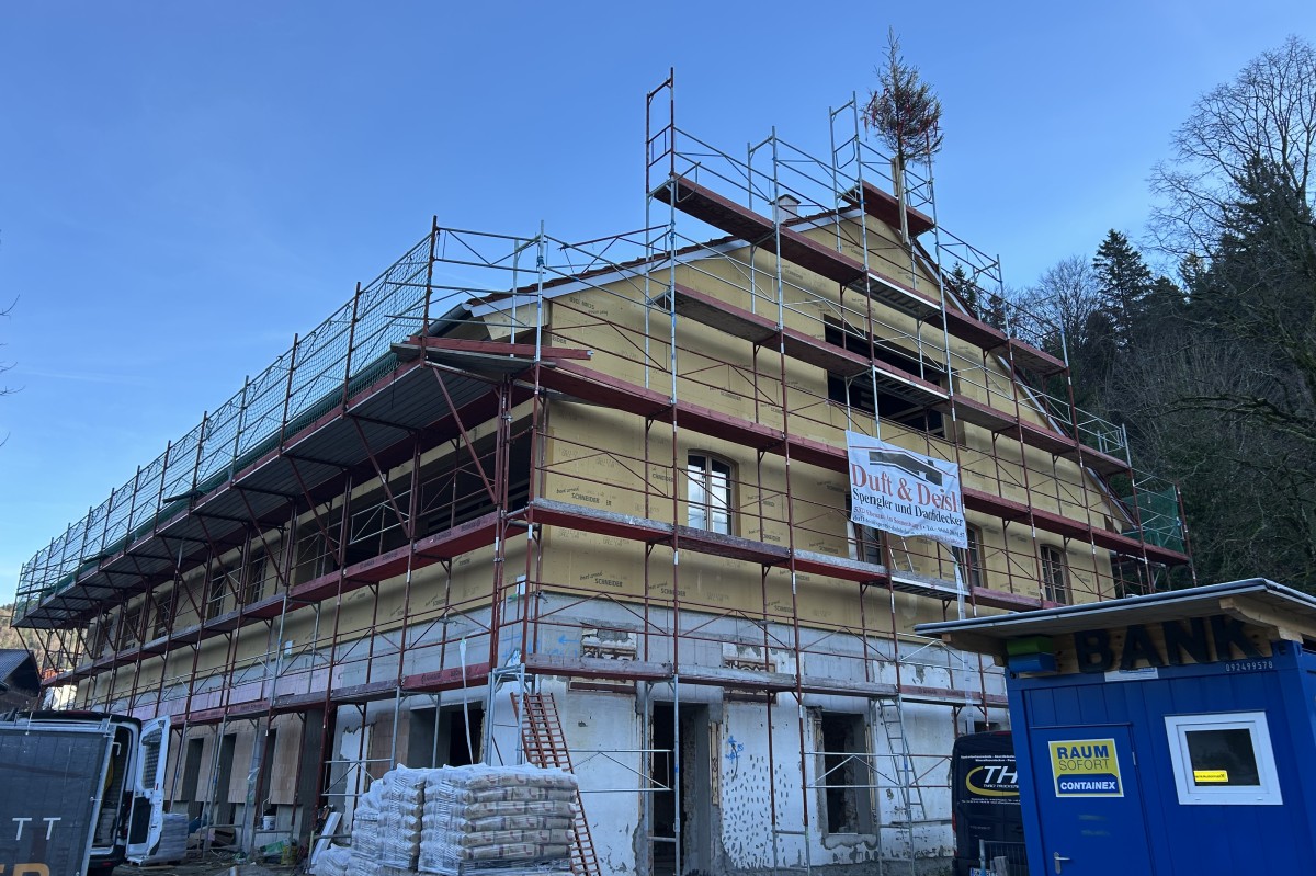 - Das sanierungsbedürftige Bestandsobjekt wird behutsam restauriert und im Nahbereich wird ein zweigeschossiger Holzbaumassivbau errichtet